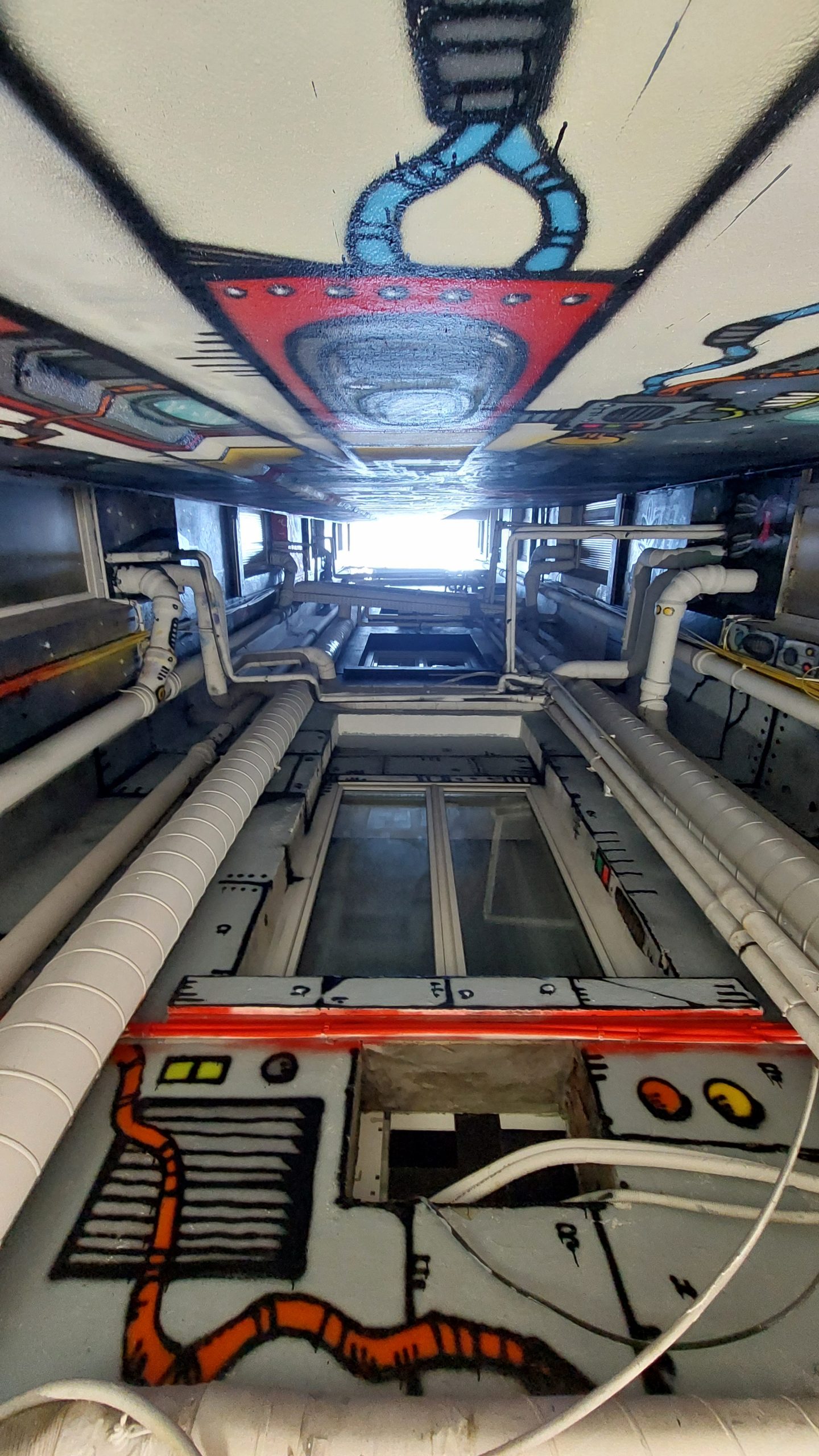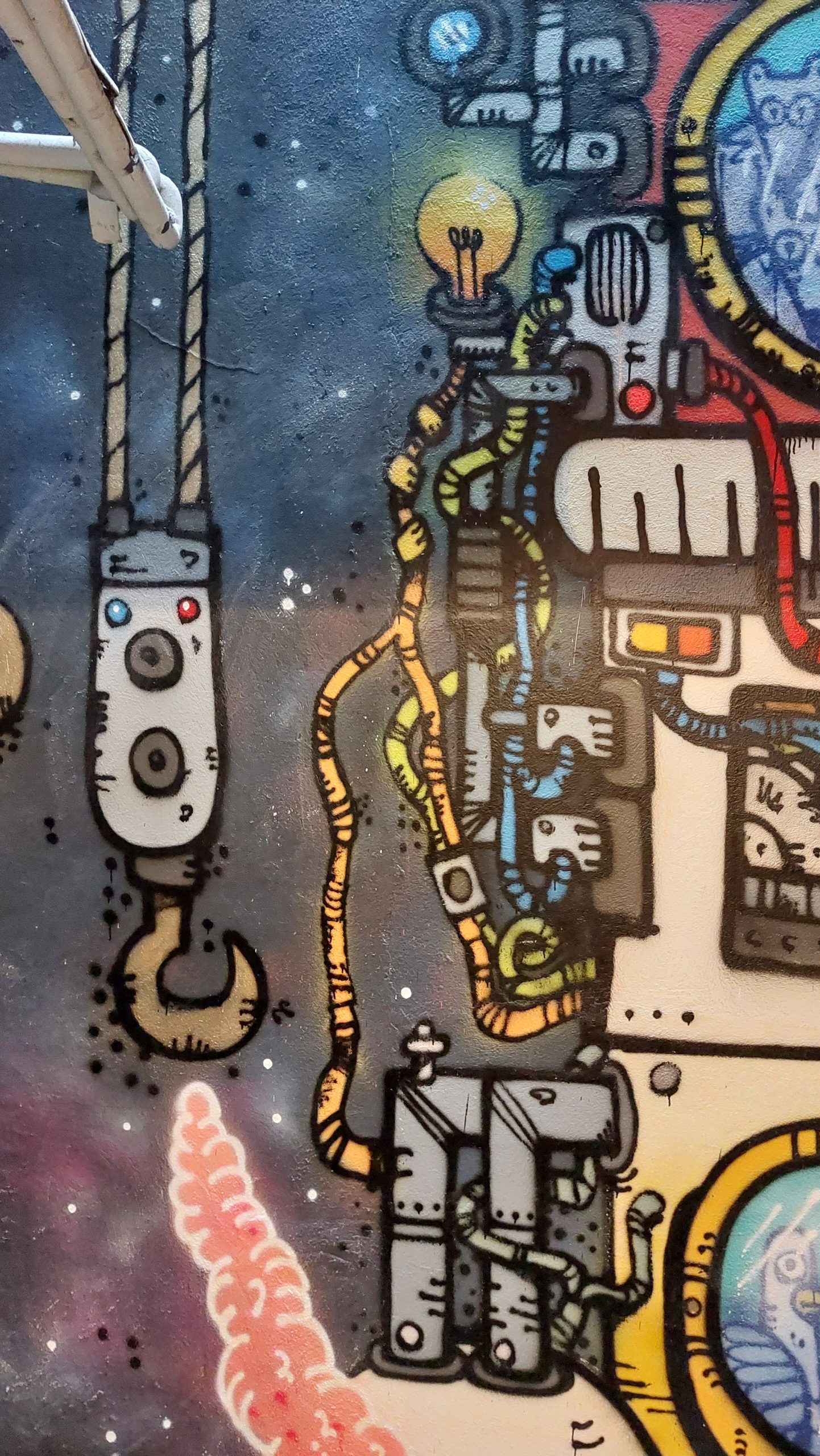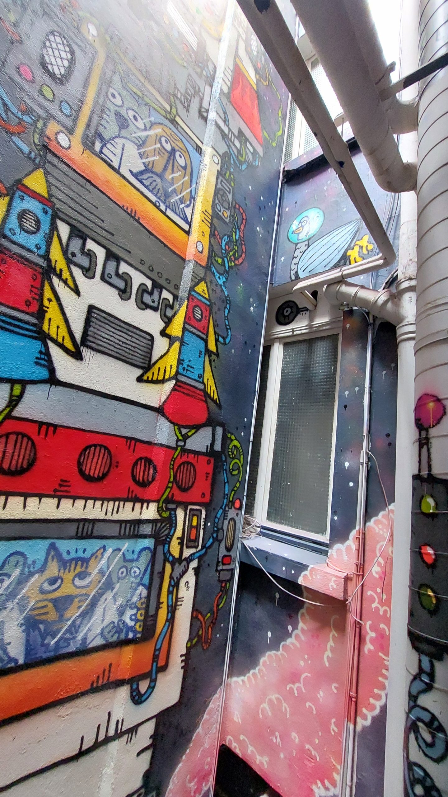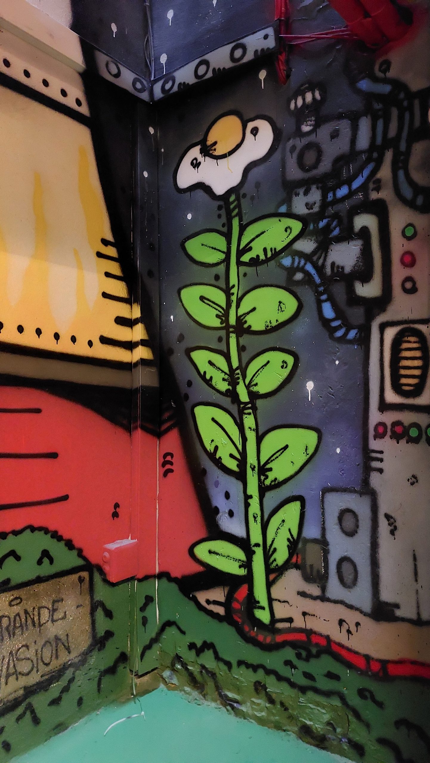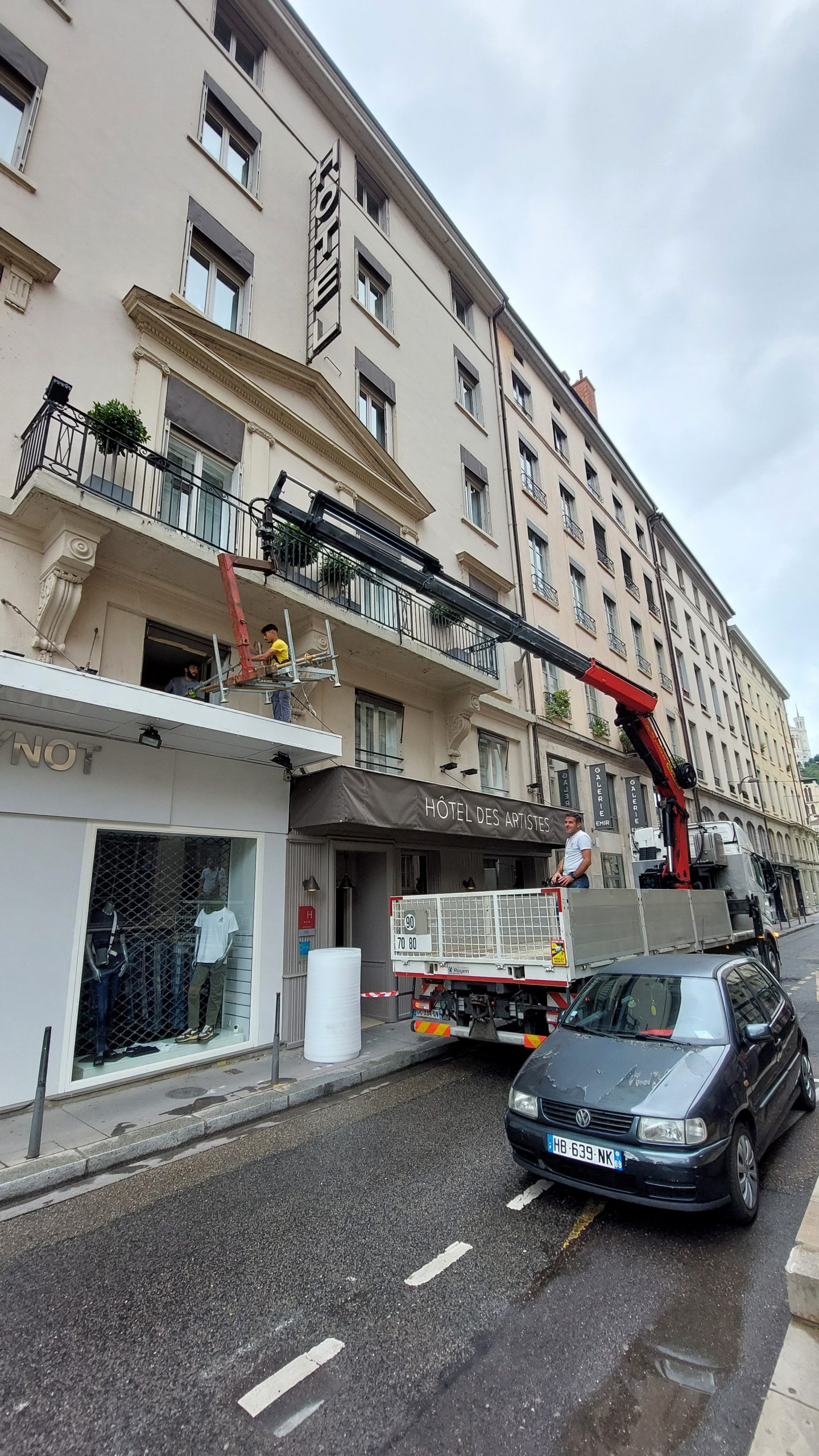 L’hôtel des artistes, établissement renommé de la place des Célestins, nous a mis au défit de réaliser une fresque de 5 étages et c’est l’artiste POES qui s’est immergé 3 semaines dans cet espace exigu doté d’un échafaudage de haute volée.