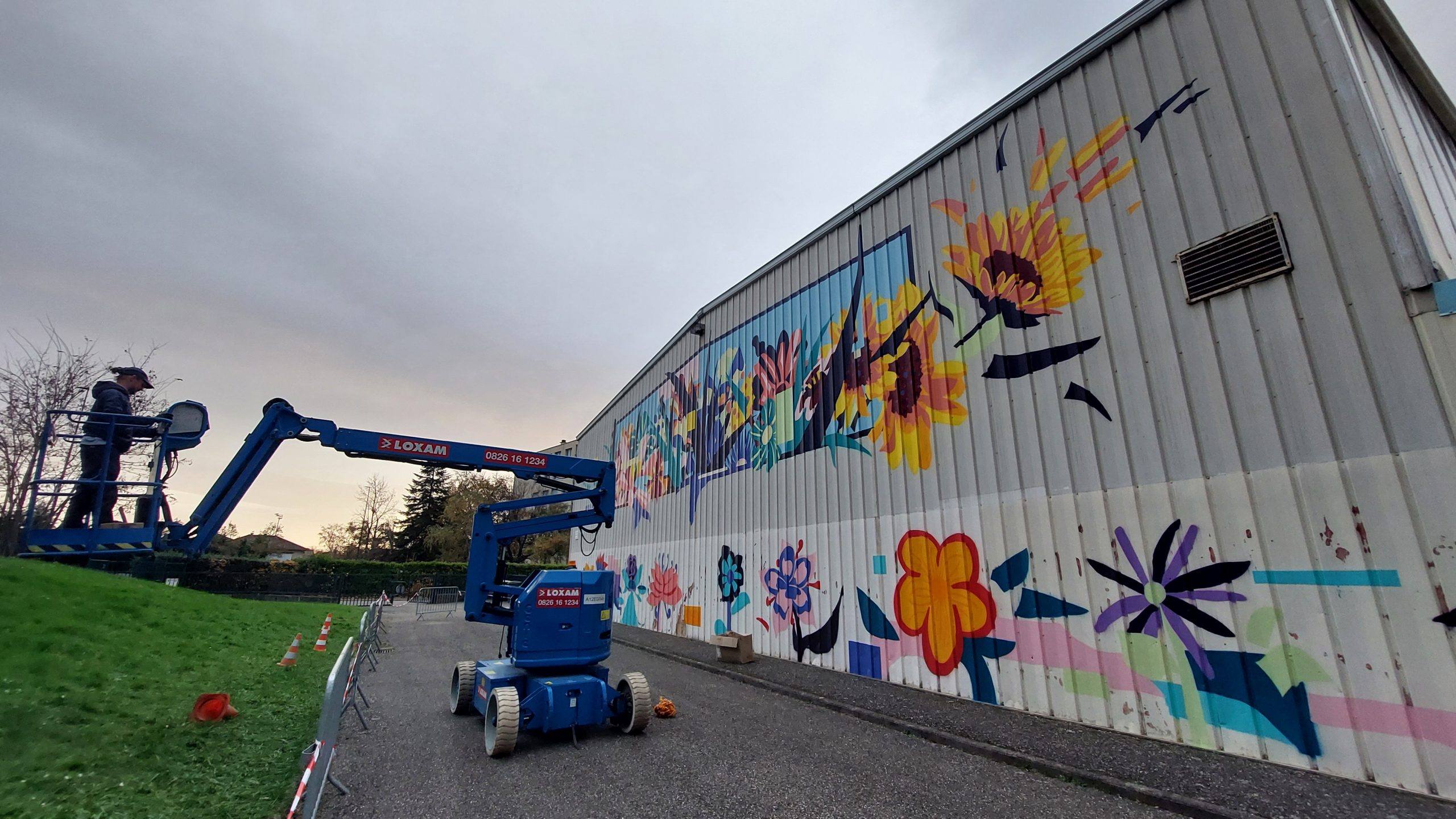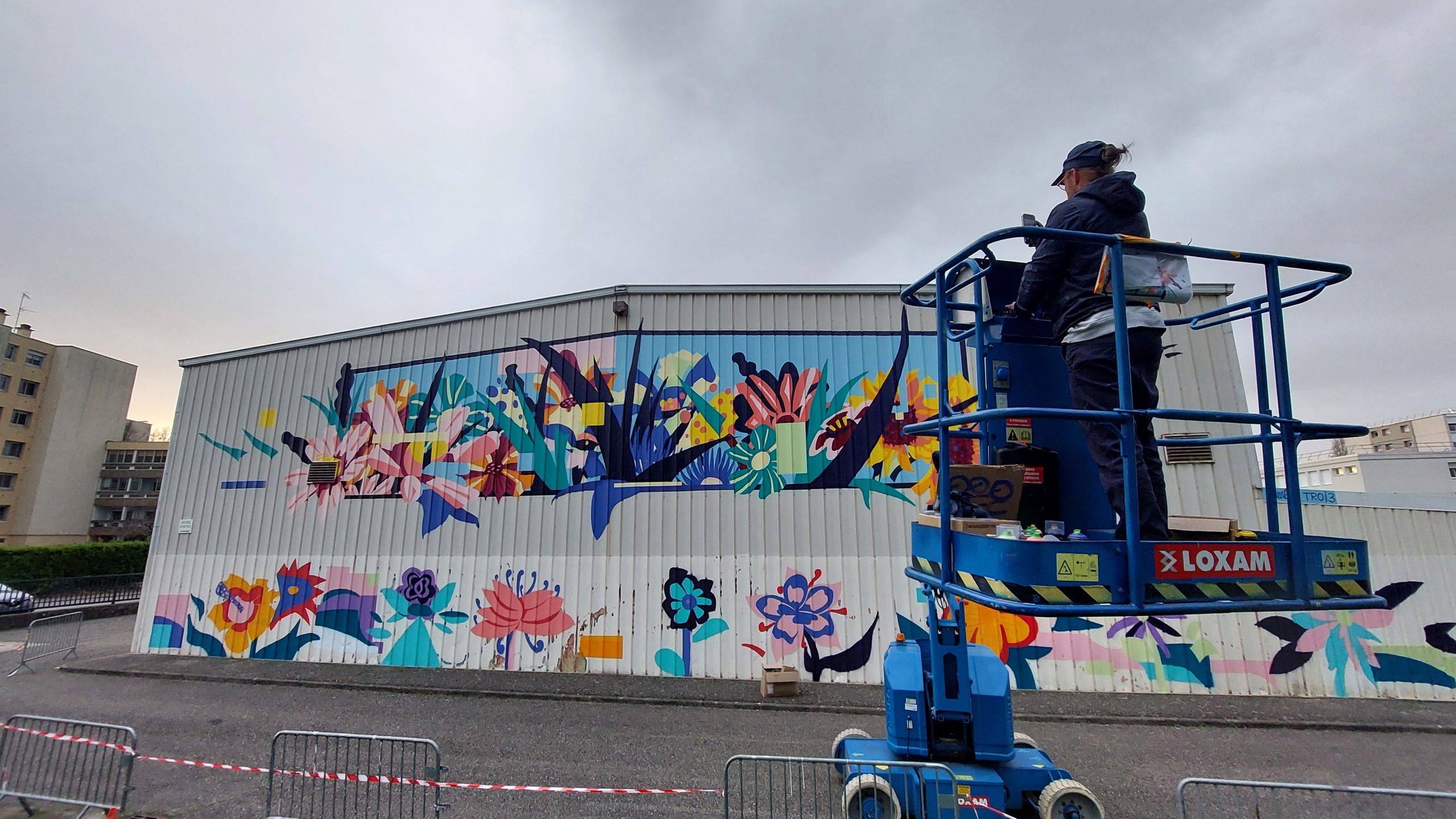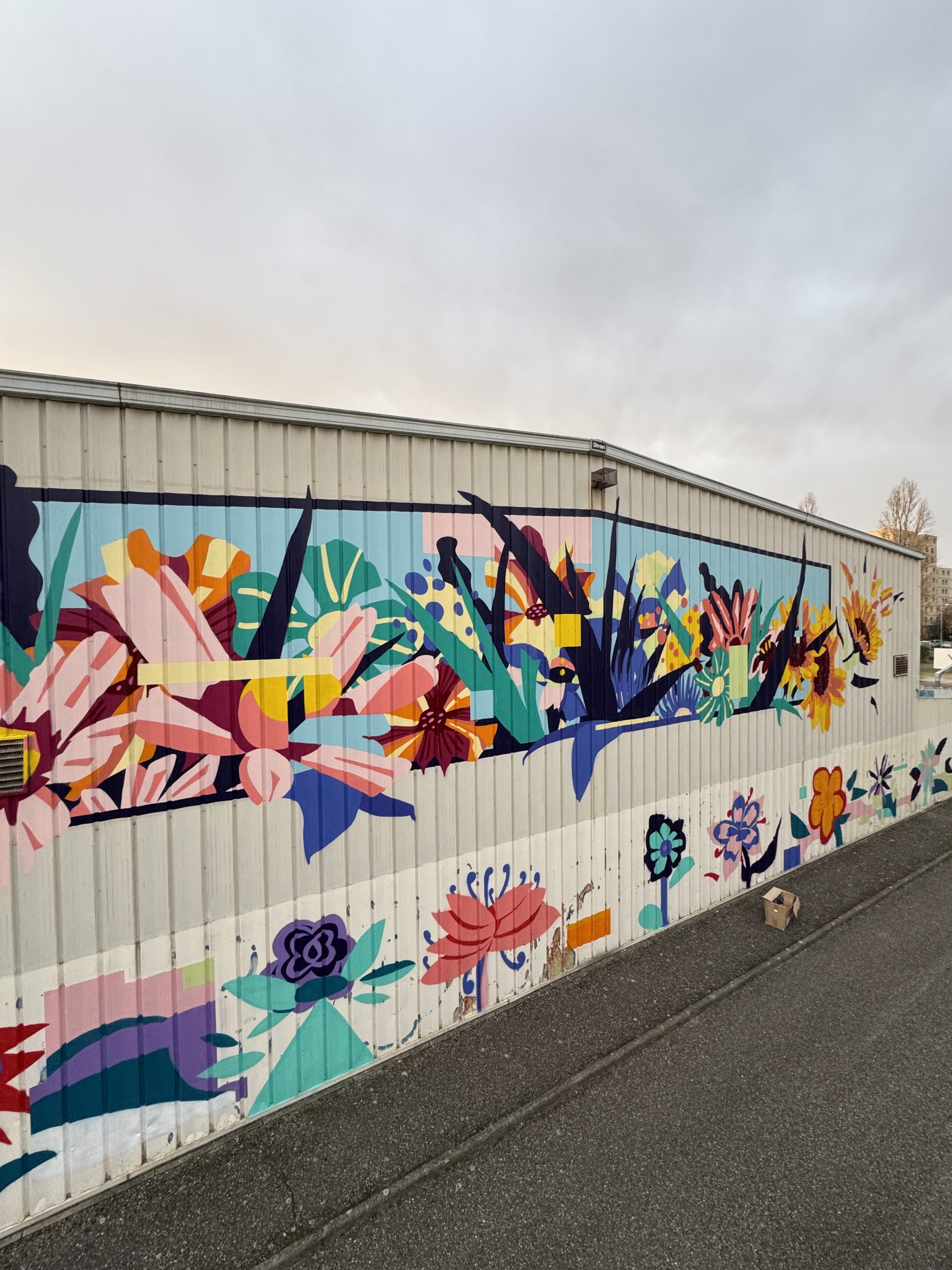 Sous l’impulsion de la Ville de Décines-Charpieu, Quetzilla a proposé une fresque florale de 45m2.