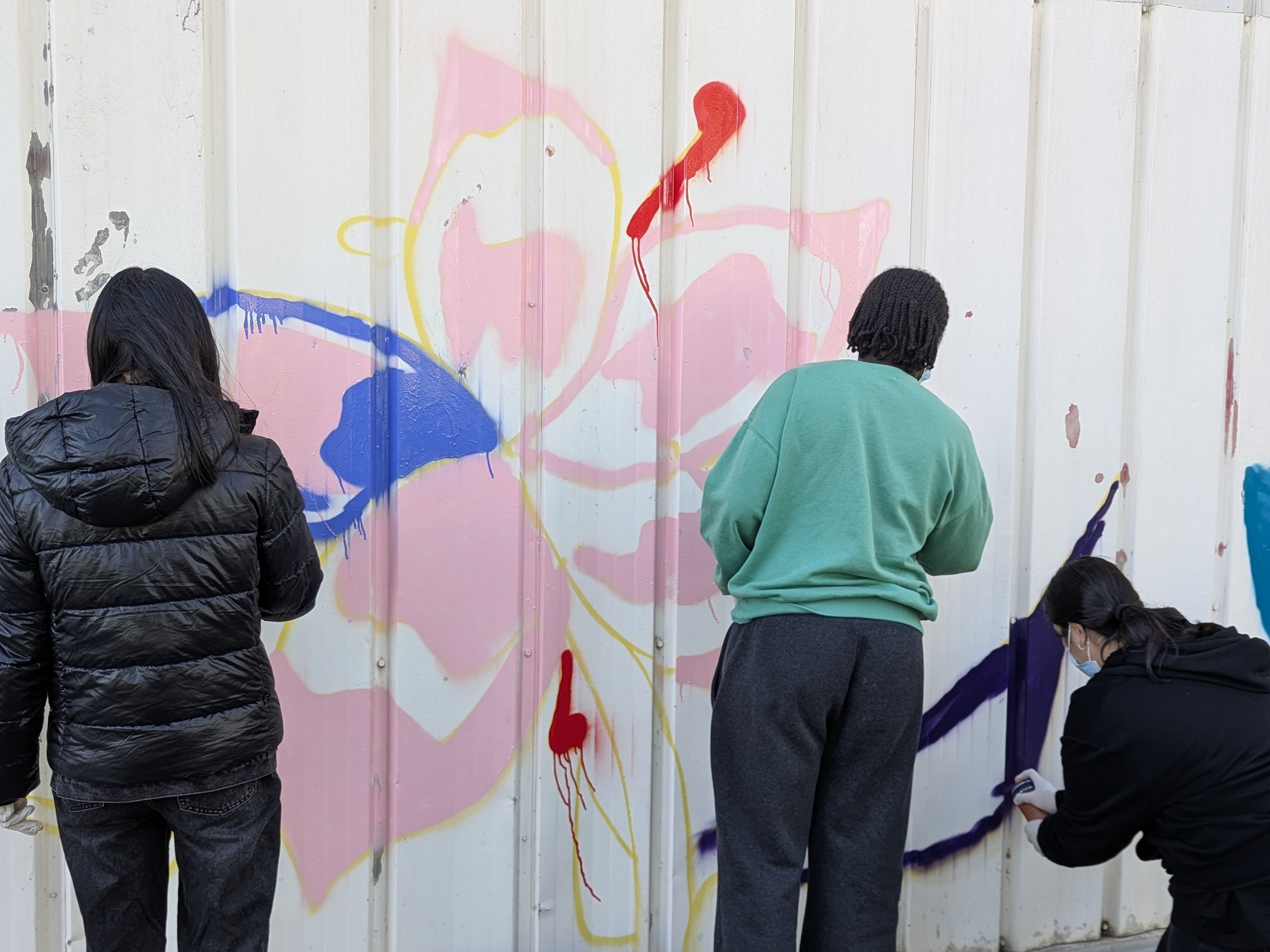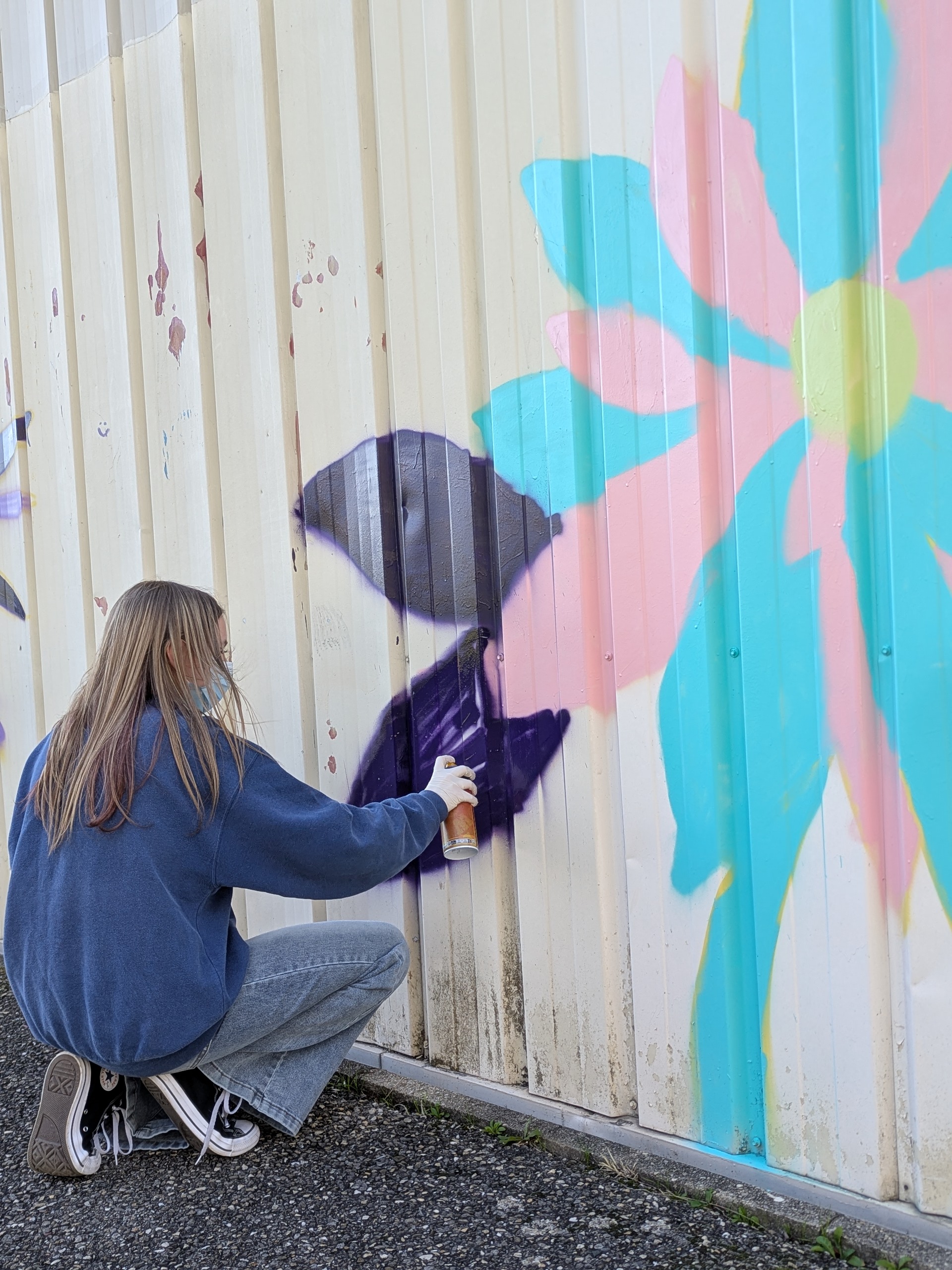 Deux journées pédagogiques ont fait écho à cette réalisation et les élèves de 3ème du collège Georges Brassens ont pu saisir la démarche de l’artiste. Chaque collégien a réalisé, sur mur et à la spray, les fleurs préparées en classe.